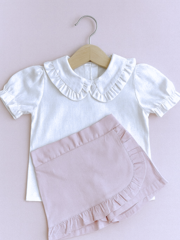 Seu design clássico com gola arredondada e babadinhos sutis traz um ar romântico e atemporal, enquanto as mangas levemente bufantes completam o visual com suavidade e conforto.
