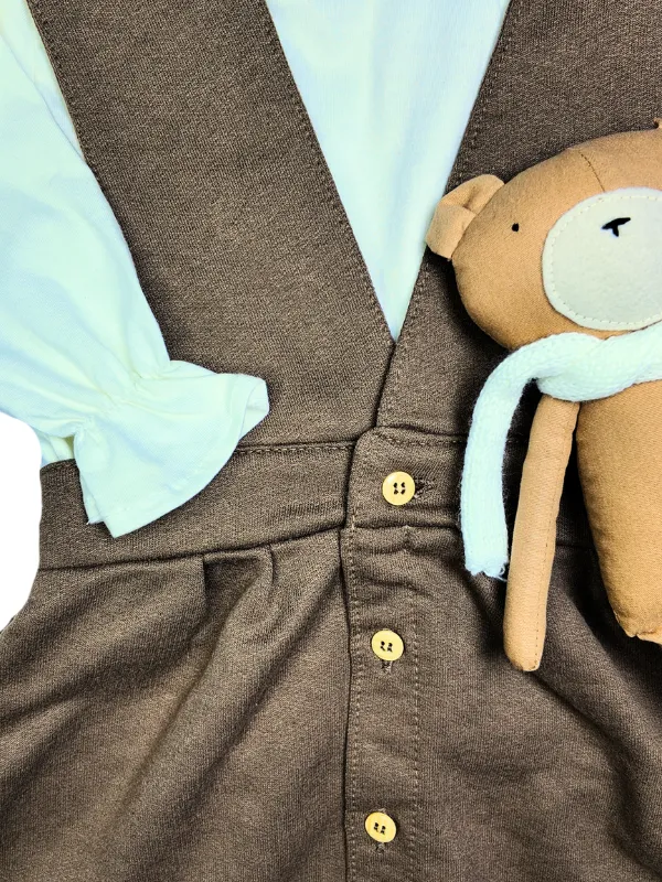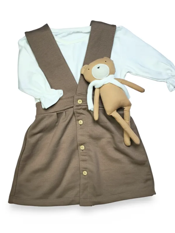 Composto por uma salopete em moletinho leve e uma blusa em algodão macio, o conjunto traz um visual encantador e confortável para o dia a dia das pequenas.