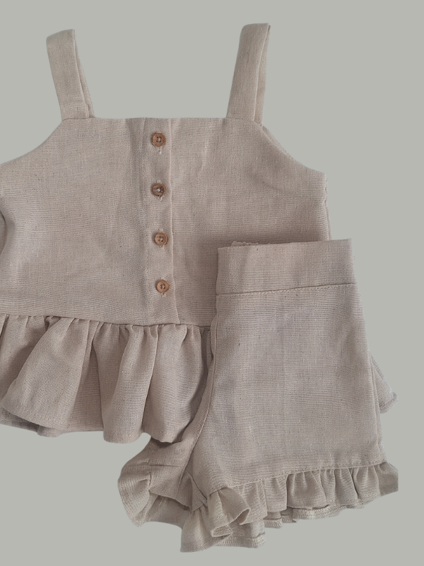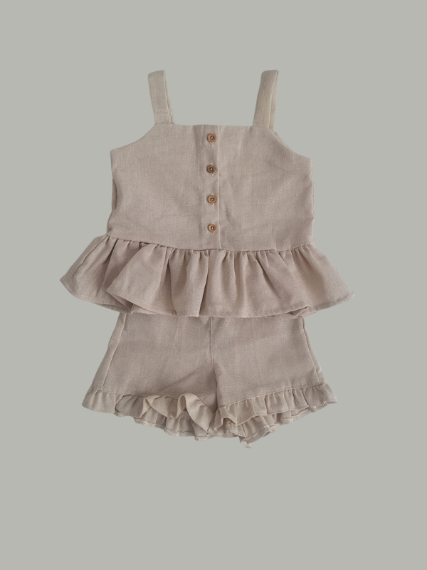 O short acompanha o mesmo acabamento com babadinhos sutis, garantindo conforto e harmonia ao conjunto.