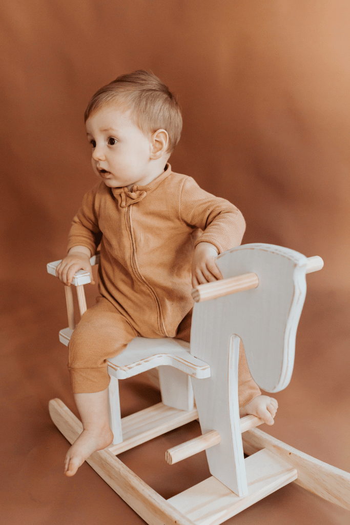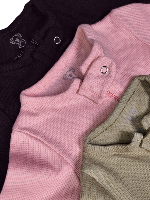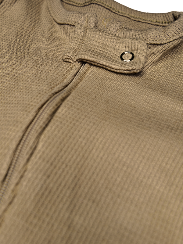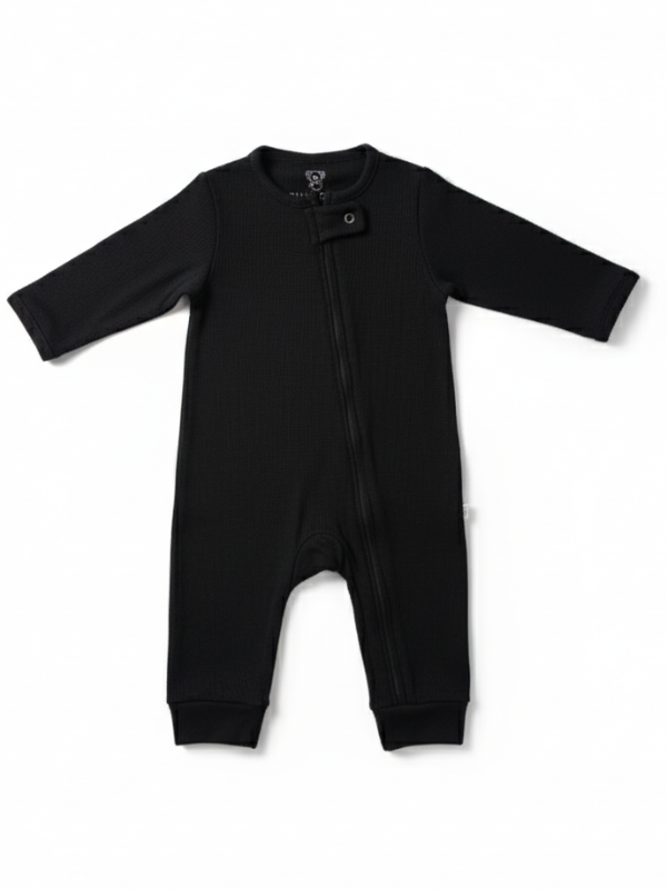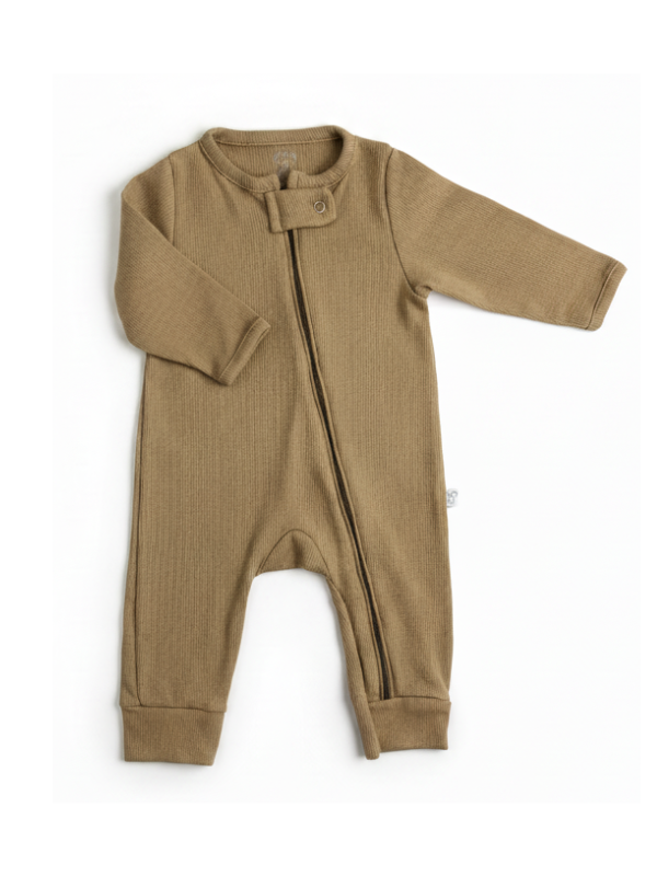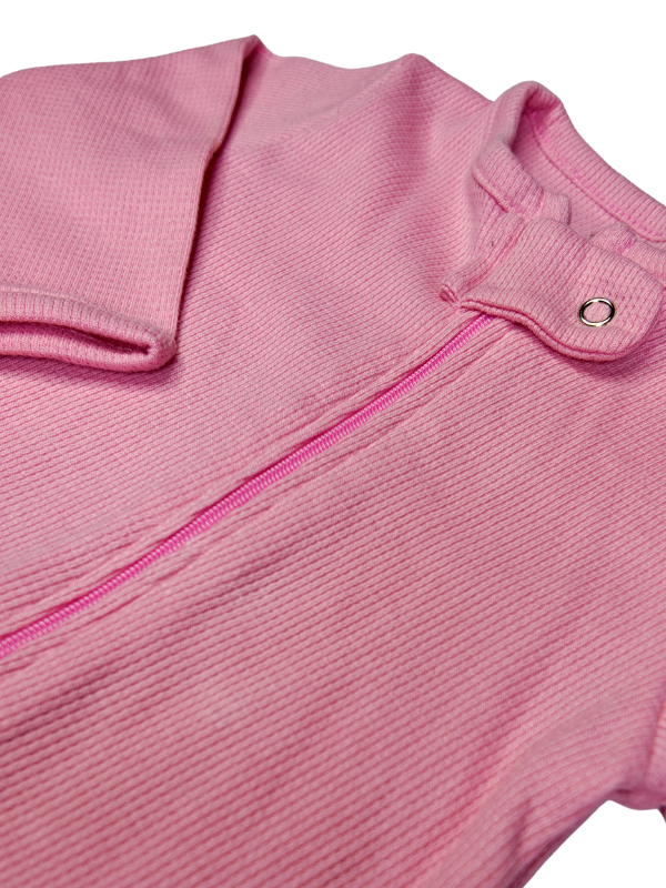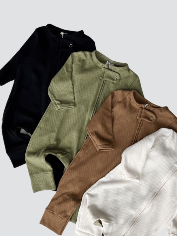 O zíper frontal facilita a troca, enquanto o design minimalista com gola redonda e punhos delicados garante um caimento perfeito e aconchegante.