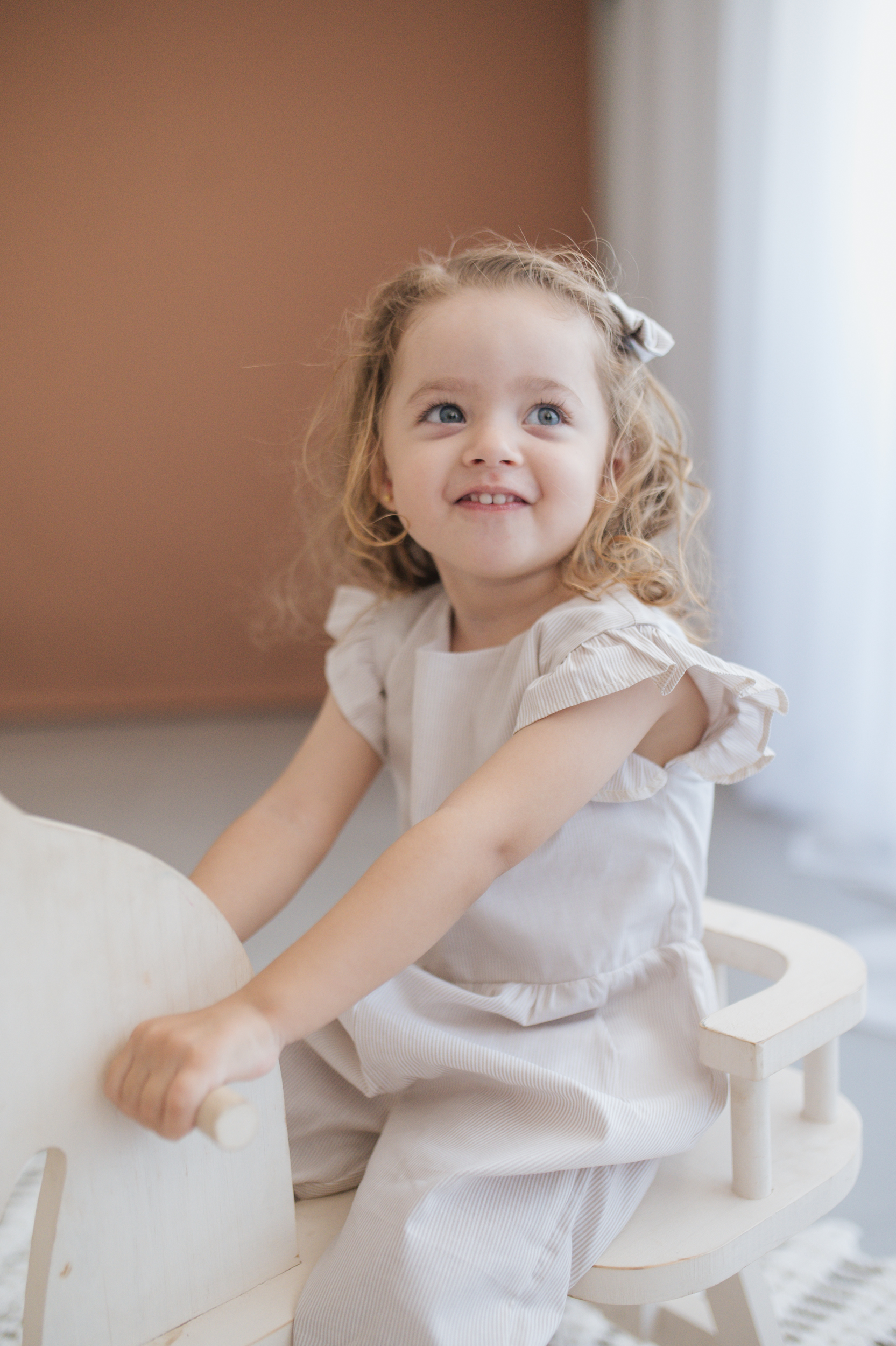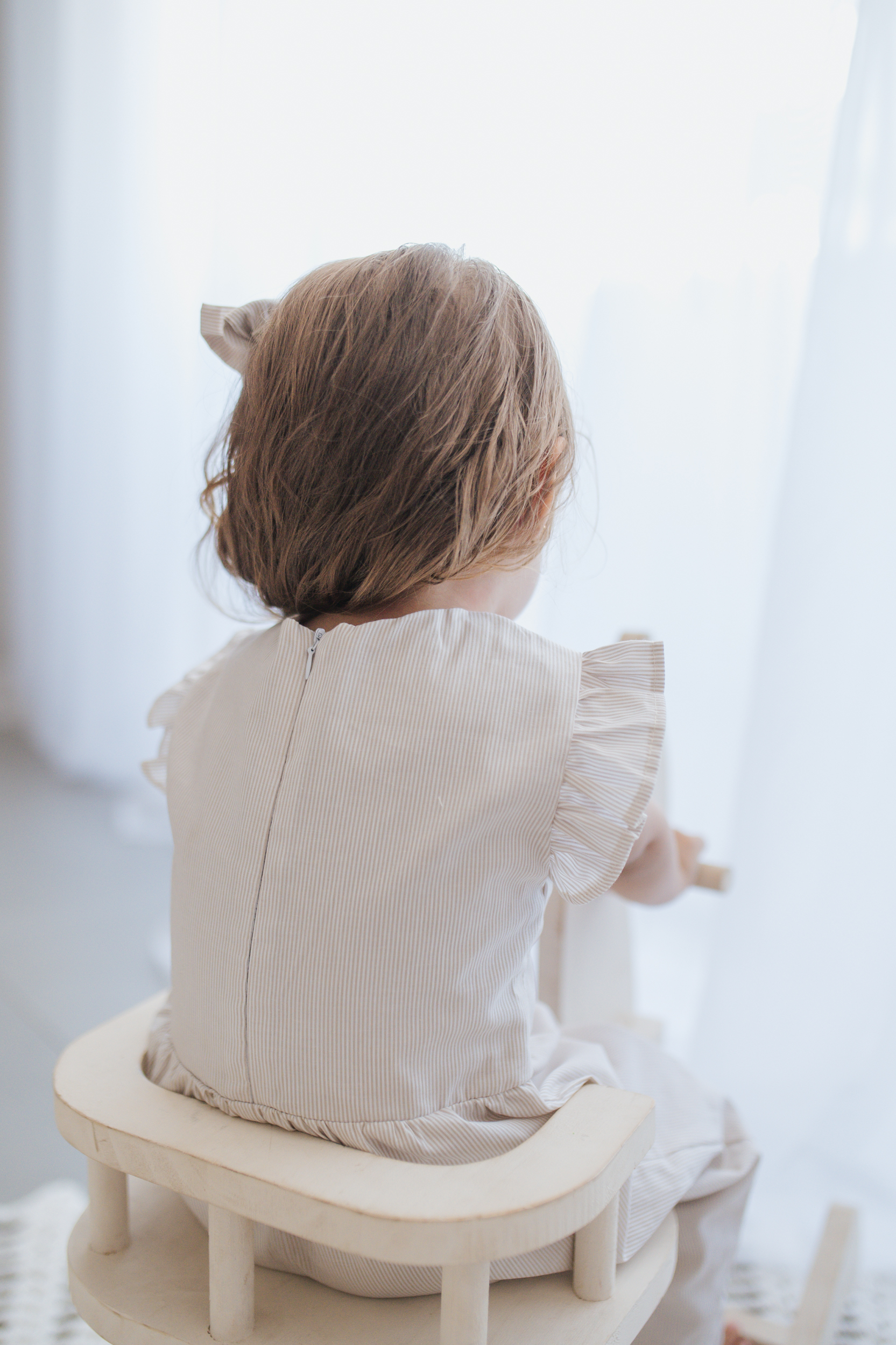Com listras finas e delicadas, o modelo apresenta um caimento elegante e confortável. Os babadinhos nas mangas e o laço de cabelo combinando completam o visual com um toque de doçura e harmonia.