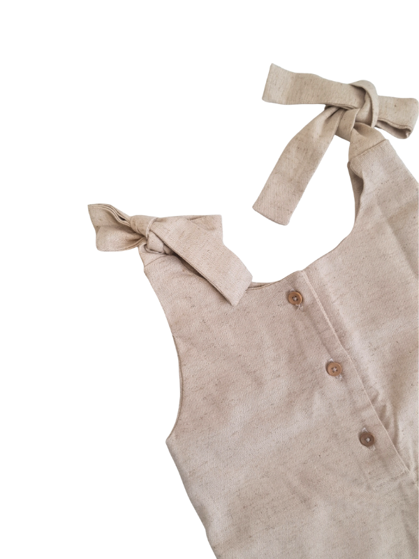 Os laços ajustáveis nos ombros, os botões frontais em madeira e o babadinho na barra trazem um charme artesanal e atemporal.