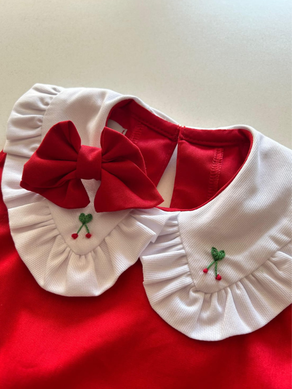 ✨ Detalhes: Bordado de cerejinhas e gola com babadinhos
