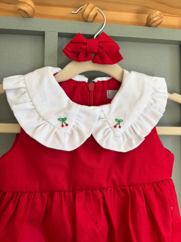 O destaque fica por conta do colarinho branco com babadinhos delicados e bordado de cerejinhas, que trazem um charme especial e um ar retrô irresistível.