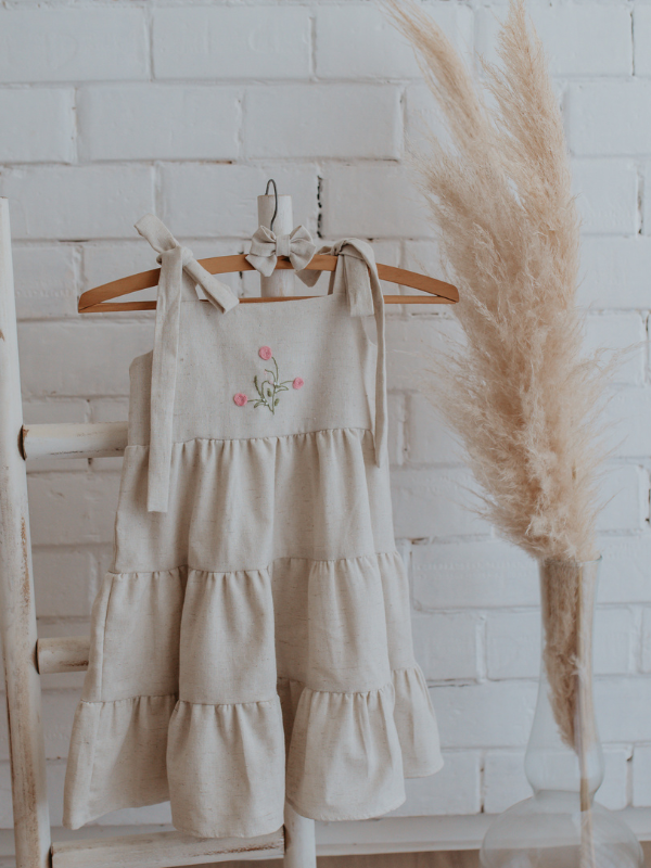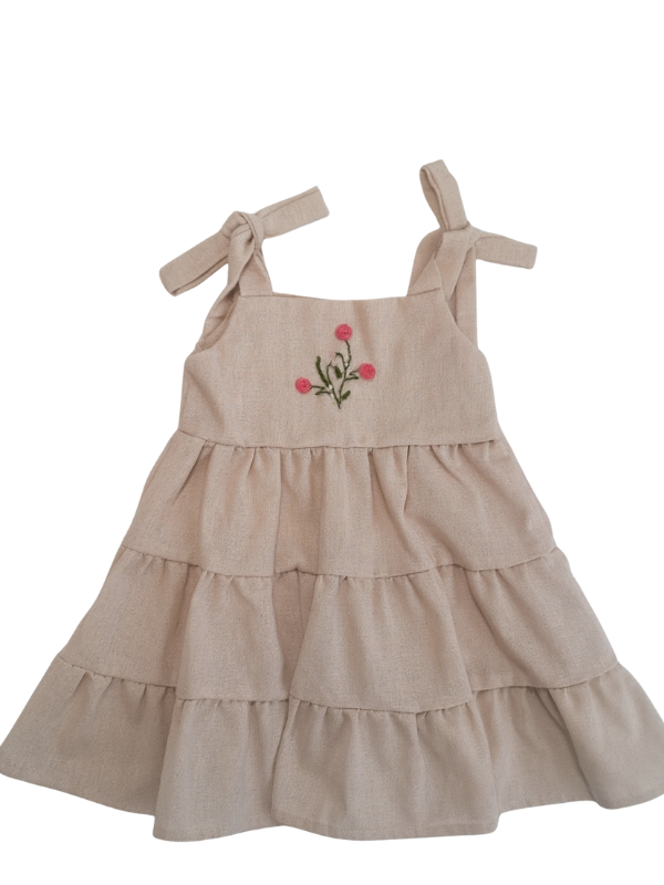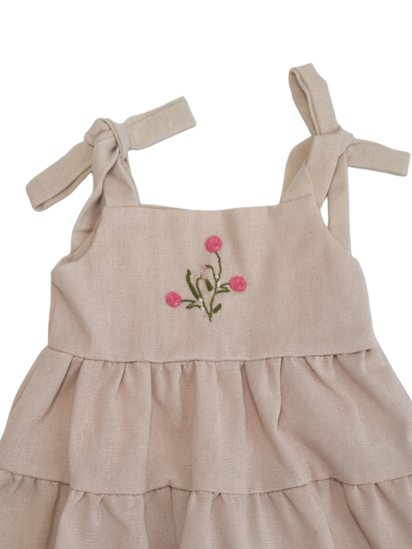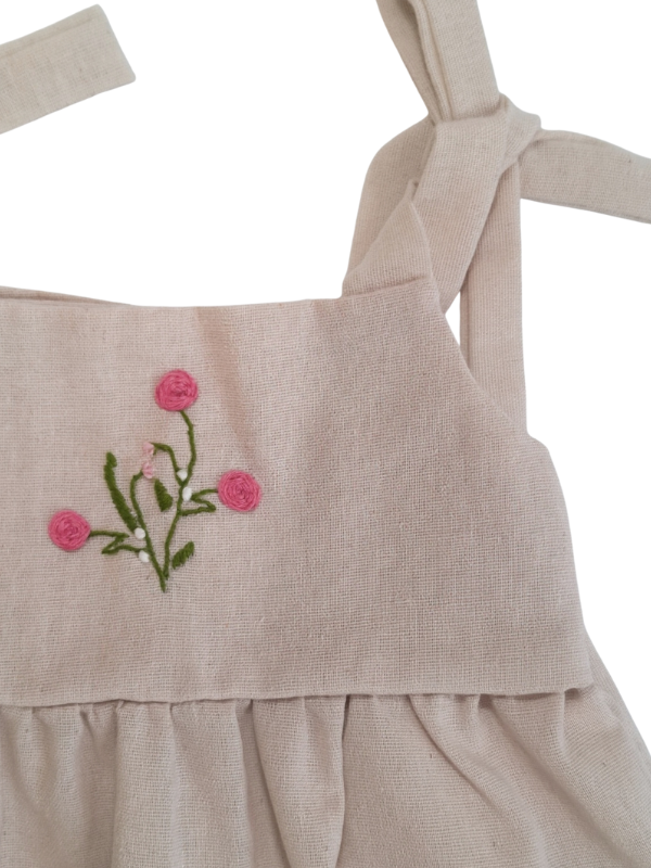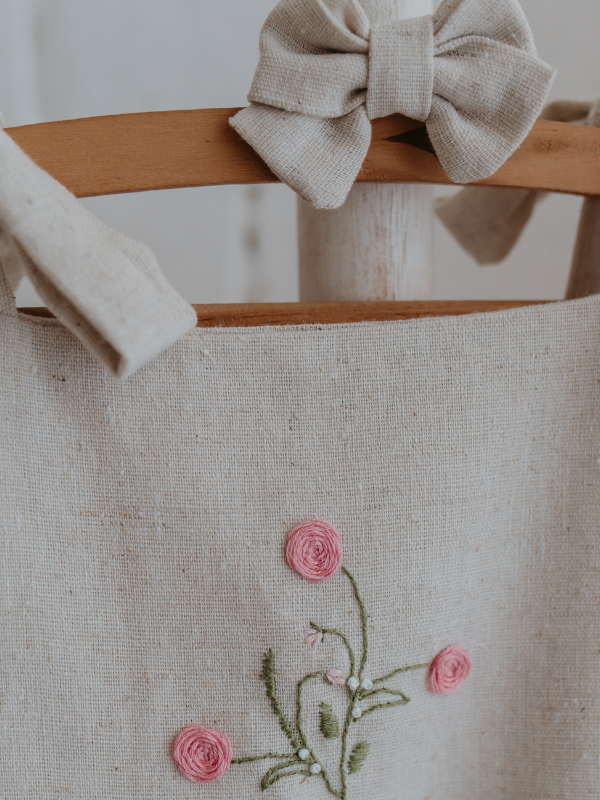 Seu destaque está no bordado à mão no busto, que traz pequenas flores em tons suaves, símbolo de delicadeza e cuidado artesanal.