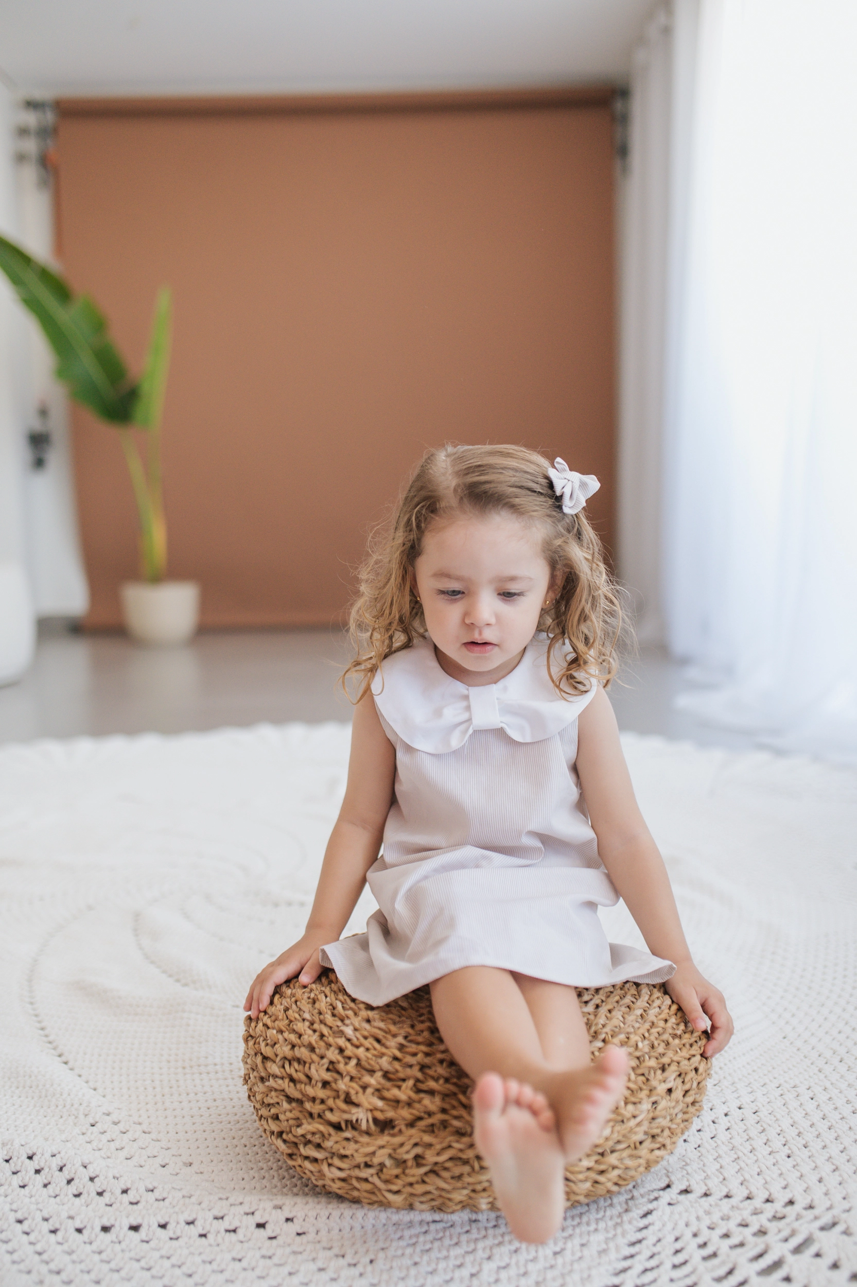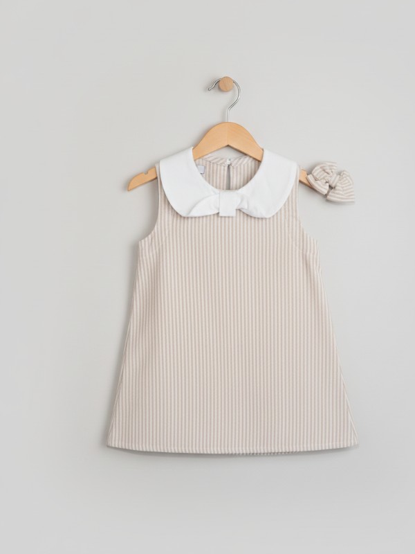 Seu charme está na gola com laço frontal, que traz um toque clássico e encantador, contrastando com o tecido listrado em tons neutros.