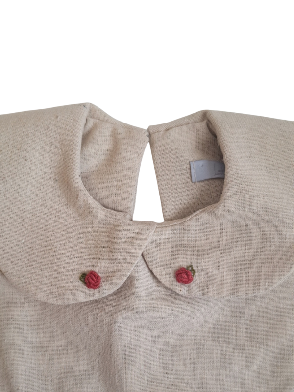 Seu charme está na gola redonda bordada à mão, com pequenas flores que traduzem o cuidado artesanal, e nos bolsinhos frontais, que adicionam funcionalidade e ternura ao design minimalista.
